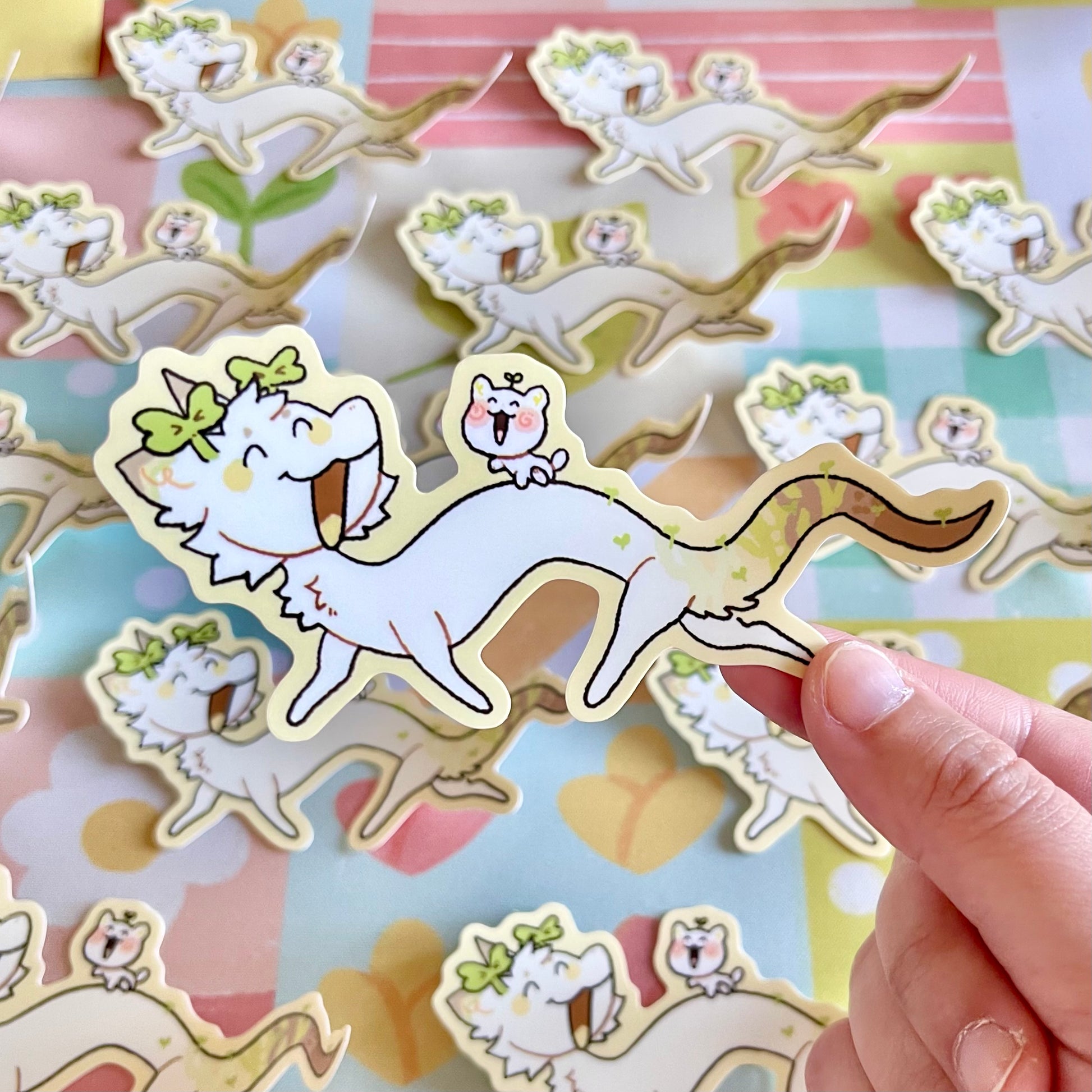 Add some whimsy to your belongings with our Dragon Rider Sticker! Featuring the adorable duo of Sprouts the Kitten and Turnip the dragon, this 2.5 inch sticker is sure to bring a smile to your face. Perfect for any animal lover and lover of all things cute and quirky.