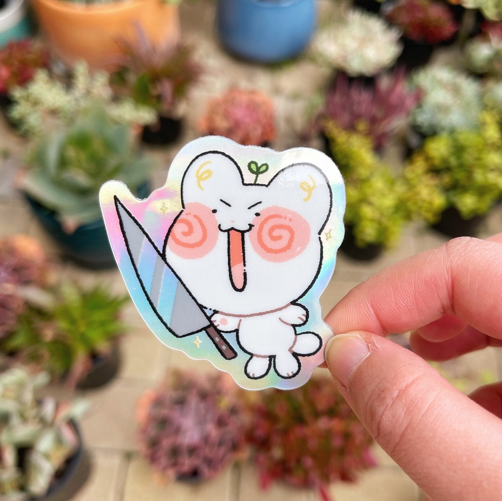 Look out! Sprouts the kitty has a knife! Show off your chaotic-ness with this cute little sticker! This sticker is approximately 2.5" and printed using pigment-based inks on holographic premium vinyl sticker paper!